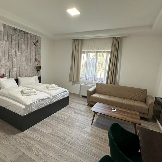 Modern, cleanly decorated room with bathroom, shower and kitchenette. The studios have views of the park or the lake. They have a floor area of 38-40 m2 and are all air-conditioned and equipped with a TV. The kitchen is equipped with a microwave, fridge and electric stove, while the bathrooms have a bidet, hairdryer and cosmetics.